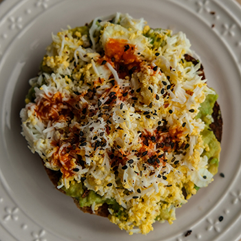 Step 5: Grate your eggs, then to your toast, add the smashed avocado, grated egg, and top with hot sauce and season to taste