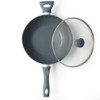 This wok is made from durable forged aluminium, offering excellent heat distribution and long-lasting performance. It features a stylish blue grey finish and soft-touch handles for comfort.