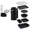 Indulge in sweet treats using the hand mixer, the perfect kitchen addition for effortless baking. This multipurpose electric whisk has 5 speed settings and comes with 2 dough hooks and 2 mixing beaters to suit a variety of baking needs. It contains a baking tray, cake tin, tart tin, loaf pan, brownie pan, roasting tin, and cooling rack, all of which feature a non-stick coating for easy cleaning. The mixer has a convenient storage base, and the bakeware has a stackable design for compact storage.
