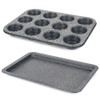 Bake delicious treats for your friends and family with this Megastone baking tray and muffin tin set from Salter. Featuring an intelligent PFOA-free Megastone non-stick coating, this oven tray set is perfect for healthily baking cookies, vegetables, and more with little to no oil. Made with strong and durable carbon steel, you can expect long-lasting quality, perfect for use time and time again. These oven pans boast easy-clean technology for low-effort washing that requires no scrubbing.