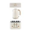 This set includes a 1.7L Fast Boil Kettle, a 4-slice toaster, and a bread bin — all finished in a stylish stone and brass design.